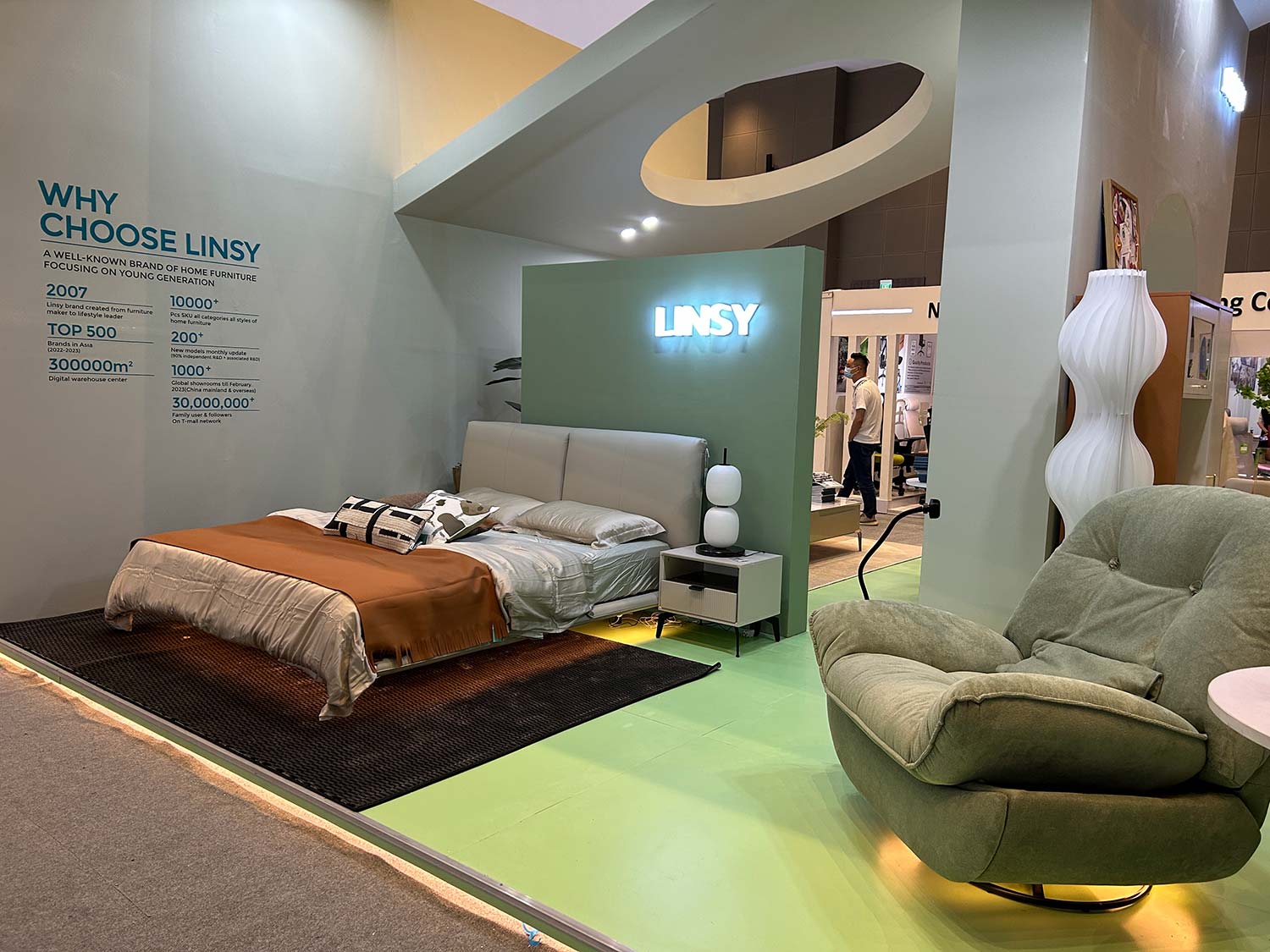 LINSY は、ベッド、ソファ、椅子、テーブルなどのモダンな新しいデザインを携えて見本市に参加します。特にG085-Aロッキングチェア は業界で多機能を備えた革新的なスマート回転ロッキングリクライニングチェアで、携帯電話ホルダー、Bluetoothスピーカー、モノクロ制御可能なアンビエントライト、高さ調節可能なアームレスト(5ギア)、USBインターフェース、アームレストを備えています。見た目の美しさと実用性を考慮した収納ボックスなど。