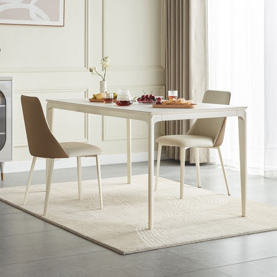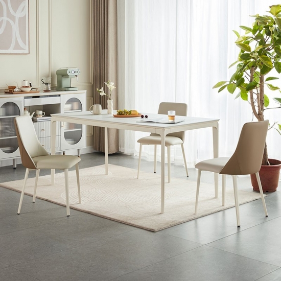 よりモダンな美学を求める人には、クリーム色のガラス製ダイニングテーブルセットが最適かもしれません。洗練されたミニマルなデザインのテーブルとクリーム色の革張りの椅子が、新鮮で洗練された雰囲気を作り出しています。自然光がガラス表面で反射し、ダイニングエリア全体の明るさを高めます。
