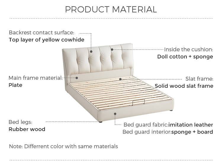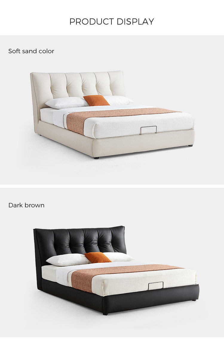 ベージュカラーの布張りレザーベッドで、柔らかさとスタイリッシュさが融合した安らぎの空間をご堪能ください。寝室の落ち着いた中心となるようデザインされたこのベッドは、贅沢で心地よい感触と、すっきりとしたモダンな美しさを兼ね備えています。モダンなデザインは、様々なインテリアにマッチします。