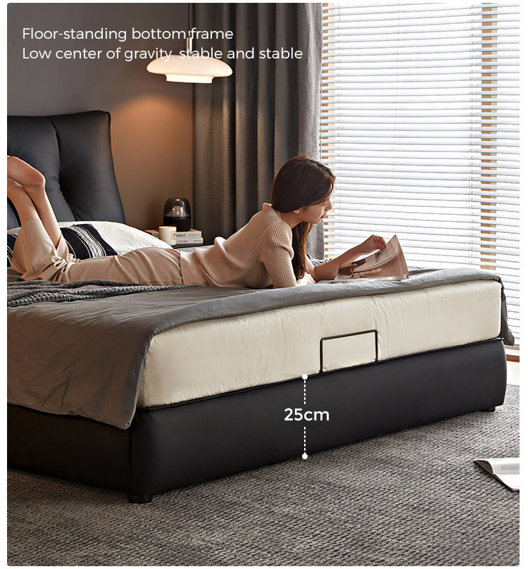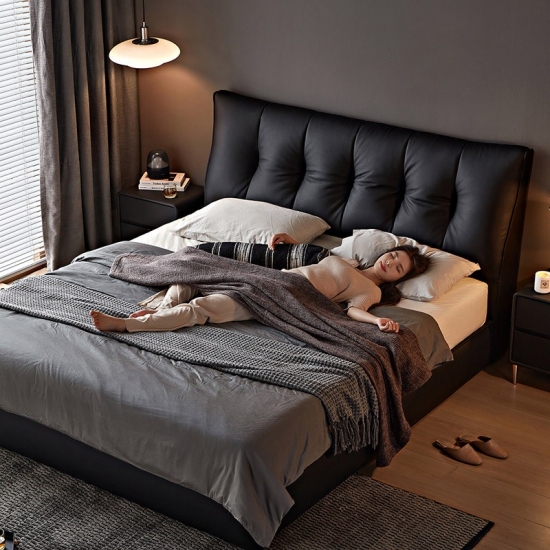 モダンなデザインと贅沢な快適さが見事に融合した、モダンブラックレザーダブルベッドで、寝室をワンランクアップさせましょう。最高級の素材とミニマルな美しさで仕上げられたこのベッドは、どんな空間にも洗練された雰囲気を添え、安らかな眠りをお約束します。