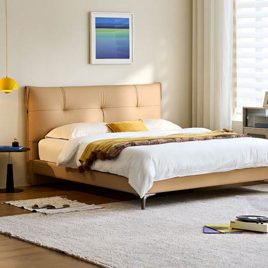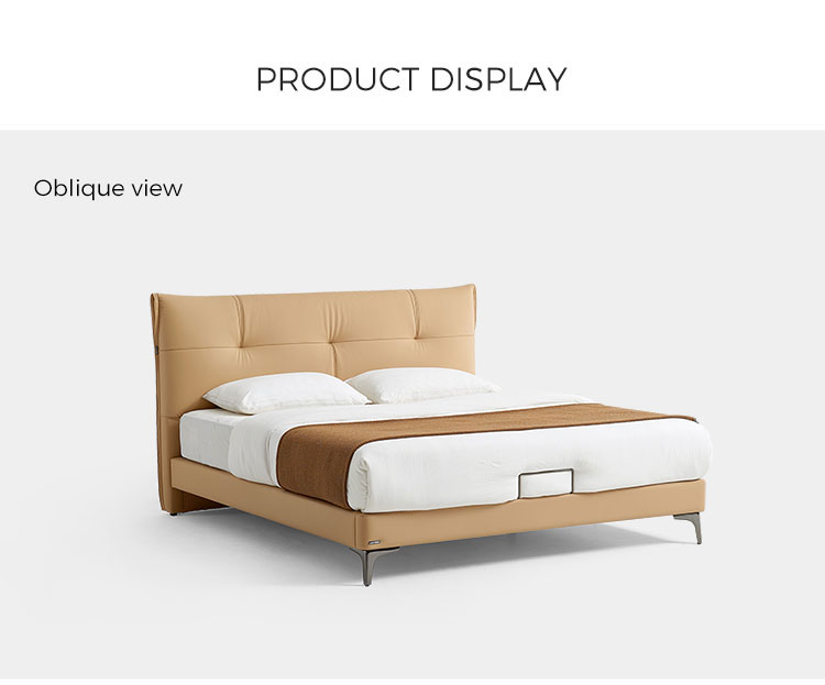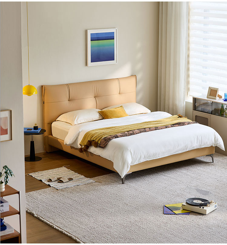 時代を超越したモダンさ:すっきりとしたラインと質感のある張り地が特徴のこのベッドは、空間の主役として見事な存在感を放ちます。