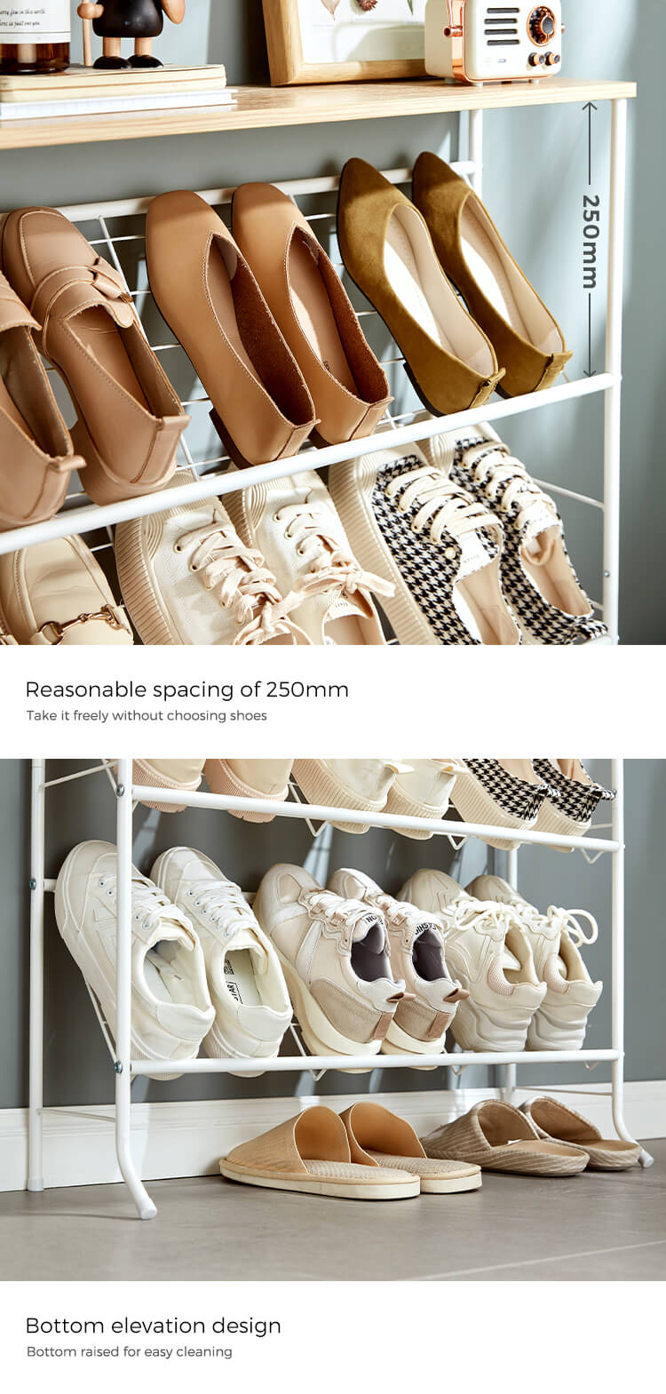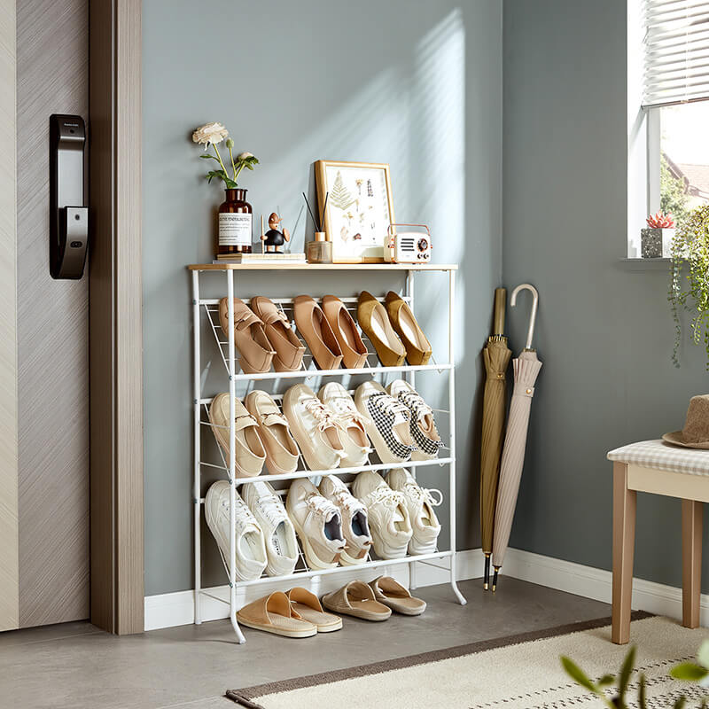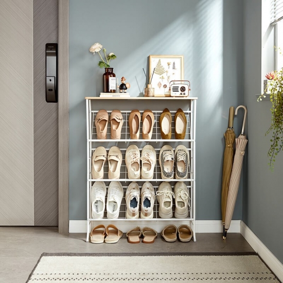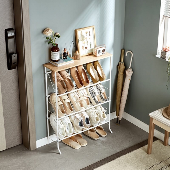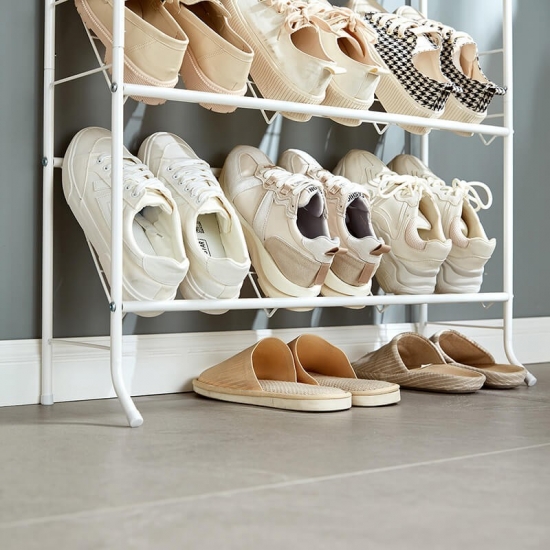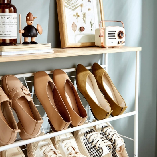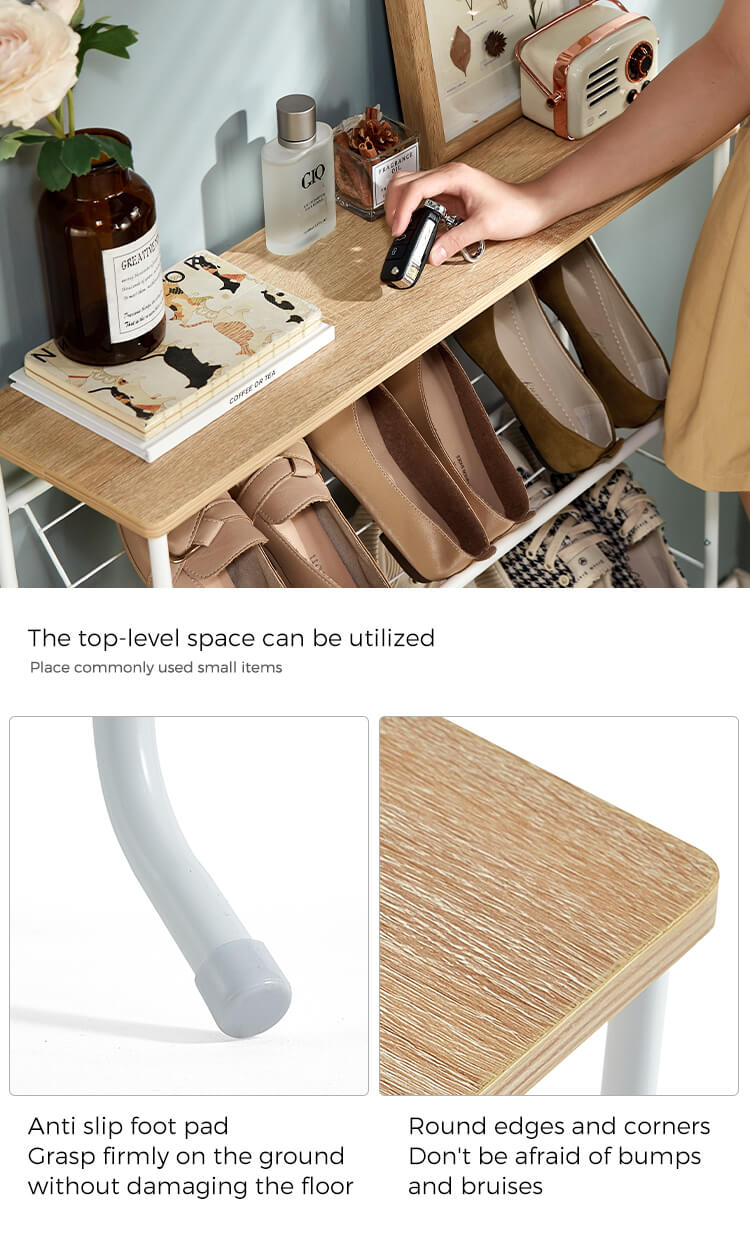これは 2 列のスチールチューブシューズラックにアップグレードされ、靴、ブーツなどだけでなく、バッグ、傘、本なども収納できるスペースが増えました。このシューズラックは、どんな家の装飾にも合うシンプルなデザインで、空間にモダンなタッチをもたらします。