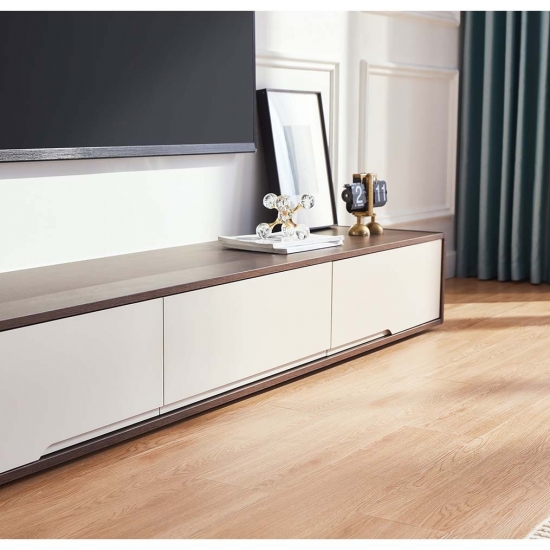 長方形のテーブルトップには、ケーブル ボックスやメディア プレーヤーを収納できるだけでなく、アート作品、装飾品、額入りの写真などを展示することもできます。複数の引き出しが装備されており、本、DVD、CD などを保管するのに十分なスペースを提供します。無垢材で作られ、洗練されたウォルナット仕上げでメッキされたこのテレビスタンドは、耐久性を保証し、インテリアに優雅さをもたらします。