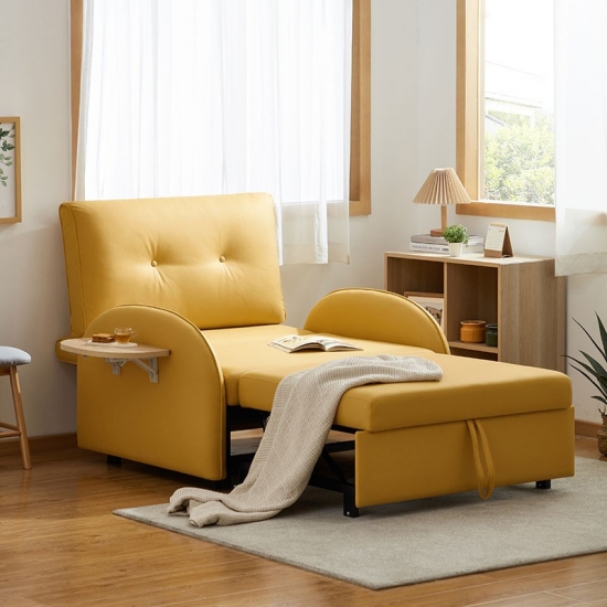 このシングルソファチェアは無垢材で作られており、ポケットスプリング構造、合成繊維とフォームの詰め物、黄色の革張りが特徴です。タイトで四角い背中と腕が特徴です。座面のボタンタフティングが見た目を高めます。リビングルームのスペースを節約するのに大きく役立ちます。