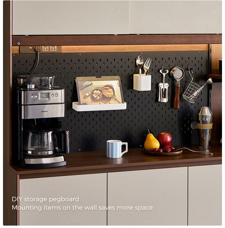 マルチ引き出し + ペグボードデザイン – スムーズに動く引き出しと調節可能なペグボード パネルを組み合わせ、整理整頓をカスタマイズできます。