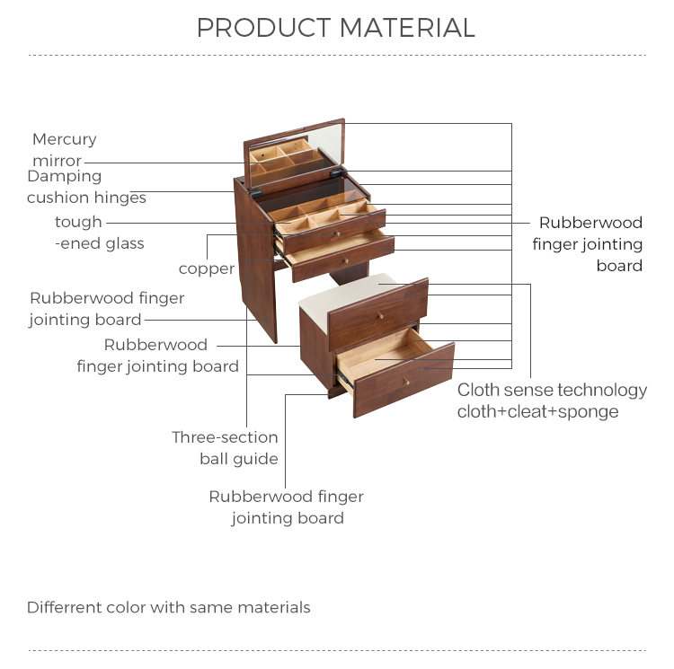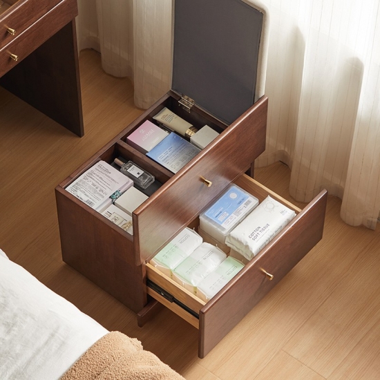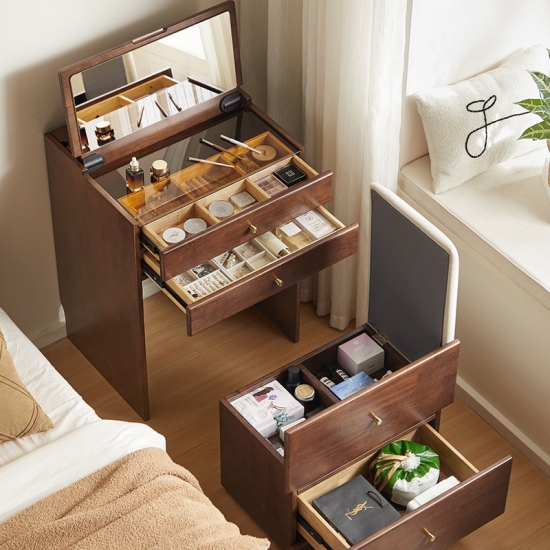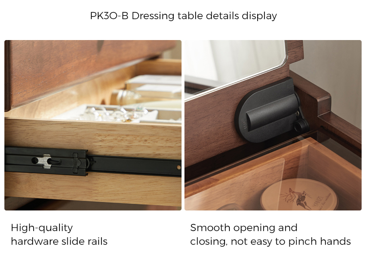 スマートな収納: フェルトで裏打ちされたソフトクローズ引き出し、ジュエリー用コンパートメント、隠れたスツールコンパートメント。