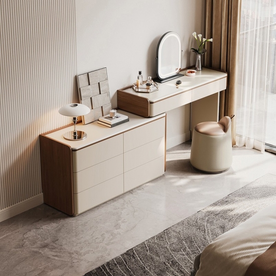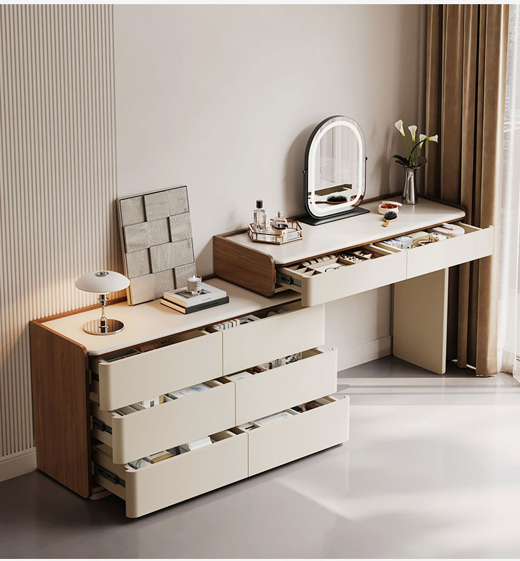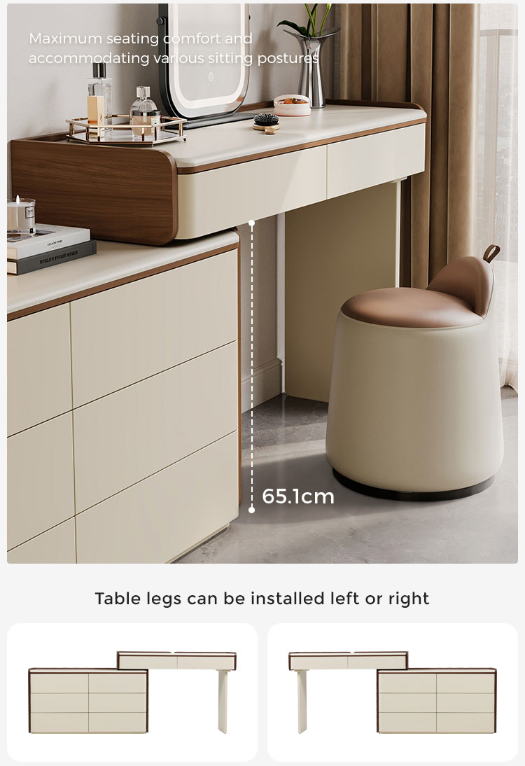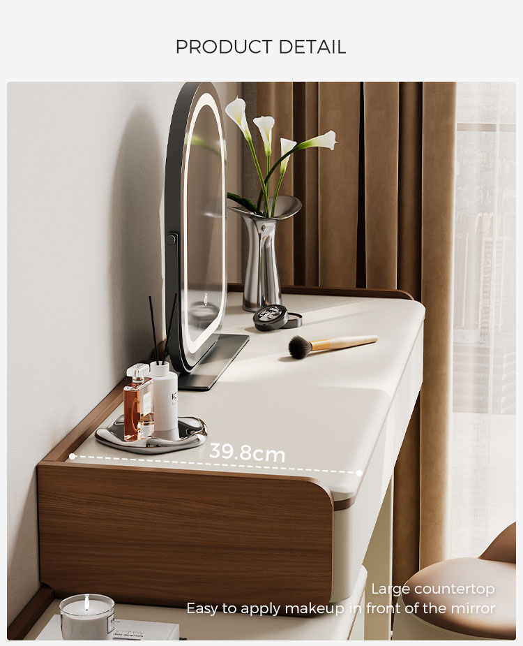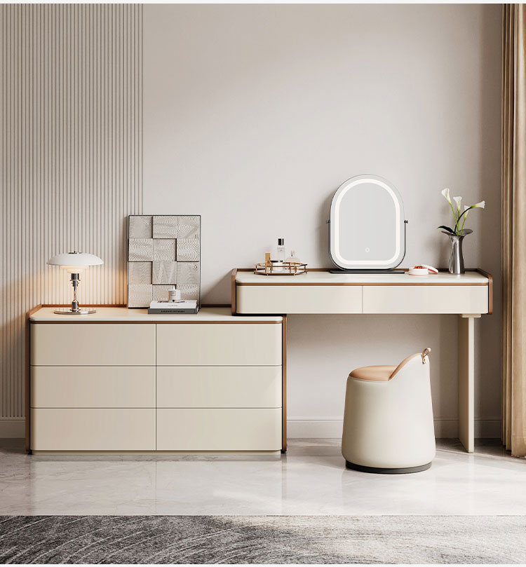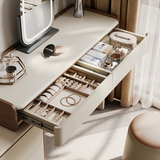 専用の化粧台:広々とした天板は、毎日のビューティールーティンに最適な空間です。香水、スキンケア用品、ジュエリーボックスなどをエレガントにディスプレイできます。